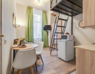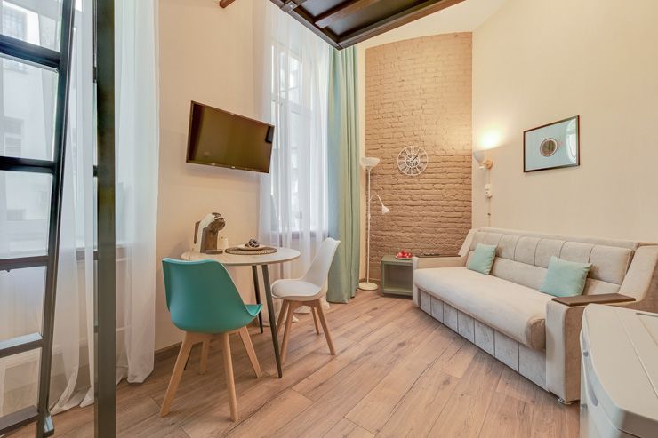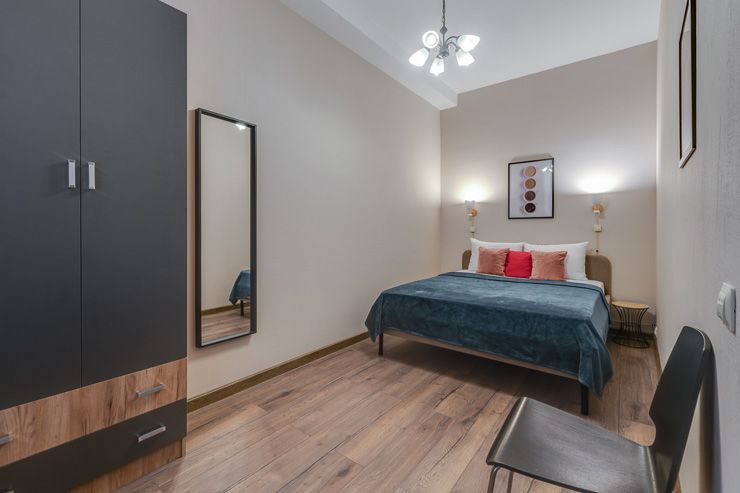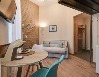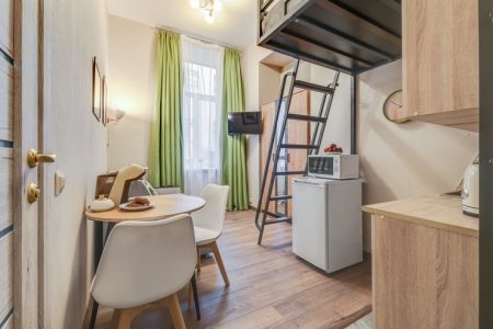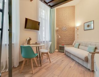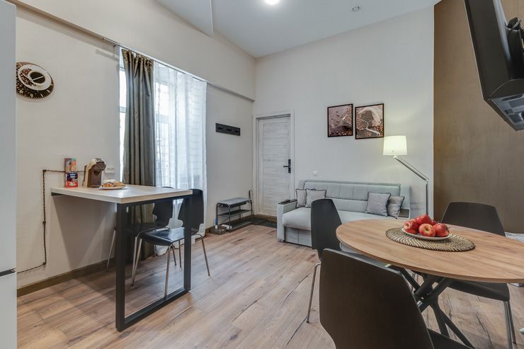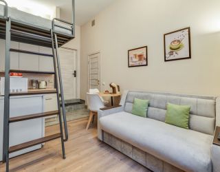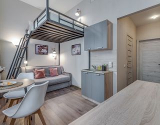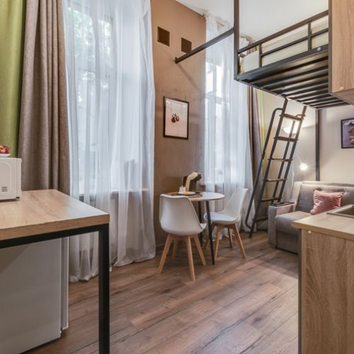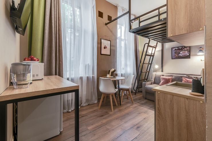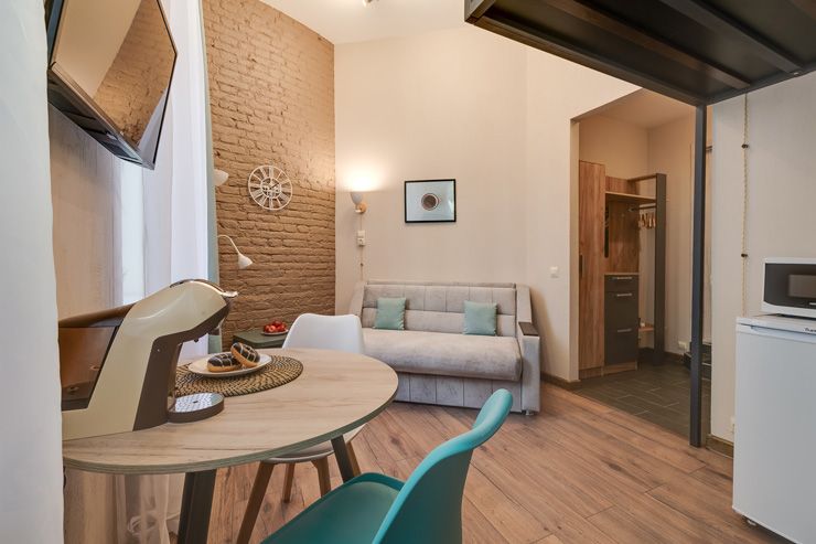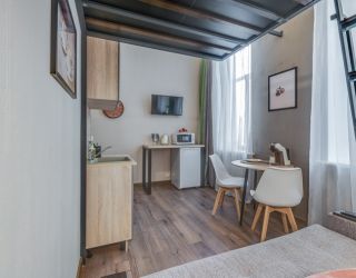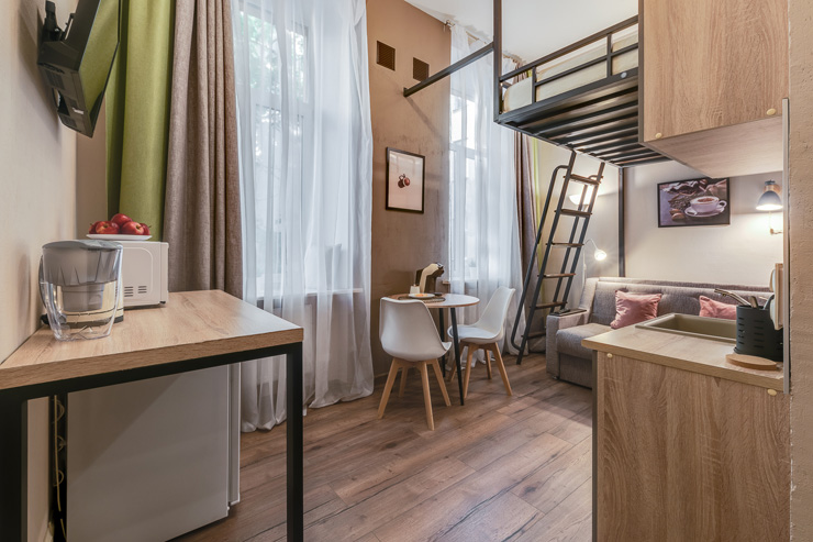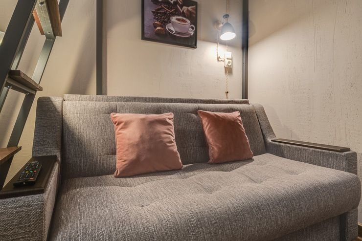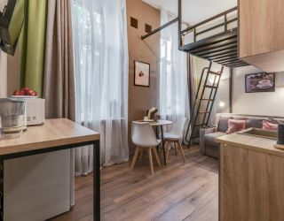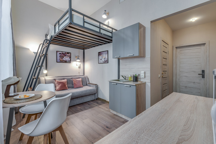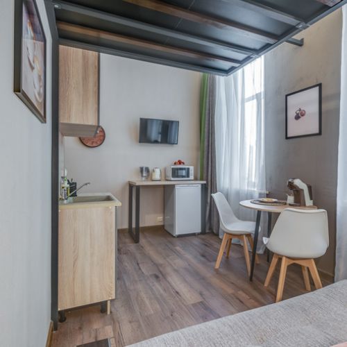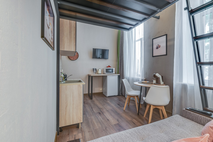 Номерной фонд включает двухуровневые студии и двухкомнатные апартаменты. Все категории стильно оформлены в приятных кофейно-серых оттенках, располагают собственной кухней и ванной комнатой.